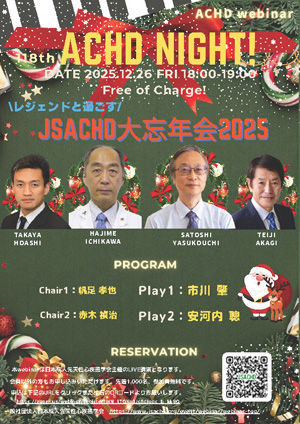 ACHDウェビナーのご案内 第118回ACHD NIGHT 「レジェンドと過ごすJSACHD大忘年会2025」 日時 2025年12月26日(金)18時~19時 座長 赤木禎治帆足孝也 演者 市川肇安河内 聰 各回で申し込みが必要です。 ポスターはこちら 今後のACHDウェビナー